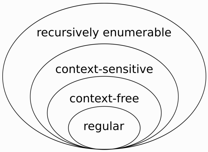 ![]() | Regular expressions are regular languages Context-free languages can be recognised by a push-down automaton Context-sensitive languages and recursively enumerable languages require more interesting recognisers |