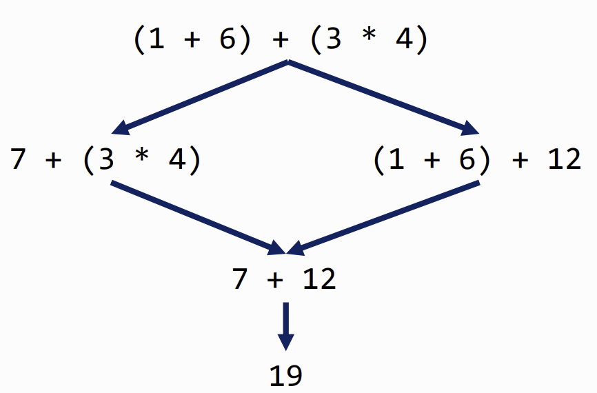 no matter which path you take in computation, the answer is always the same (no side-effects)