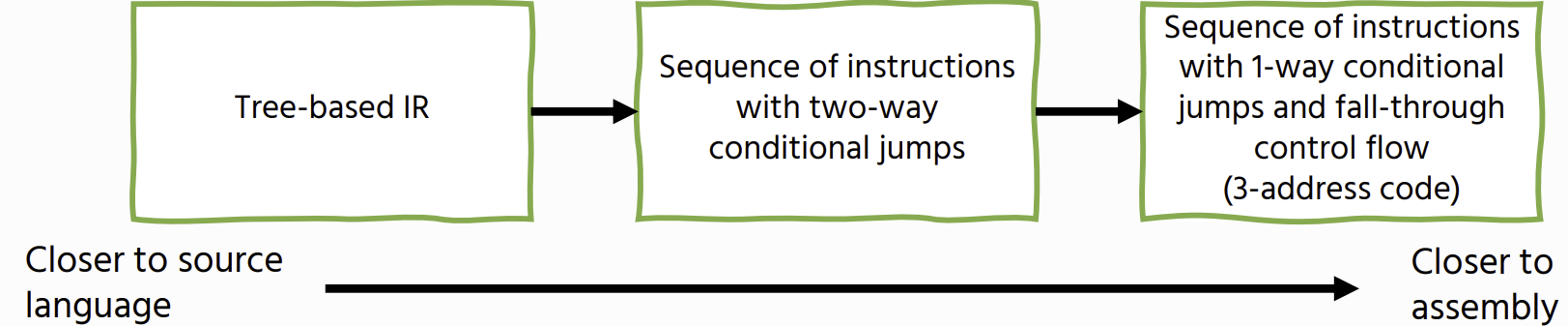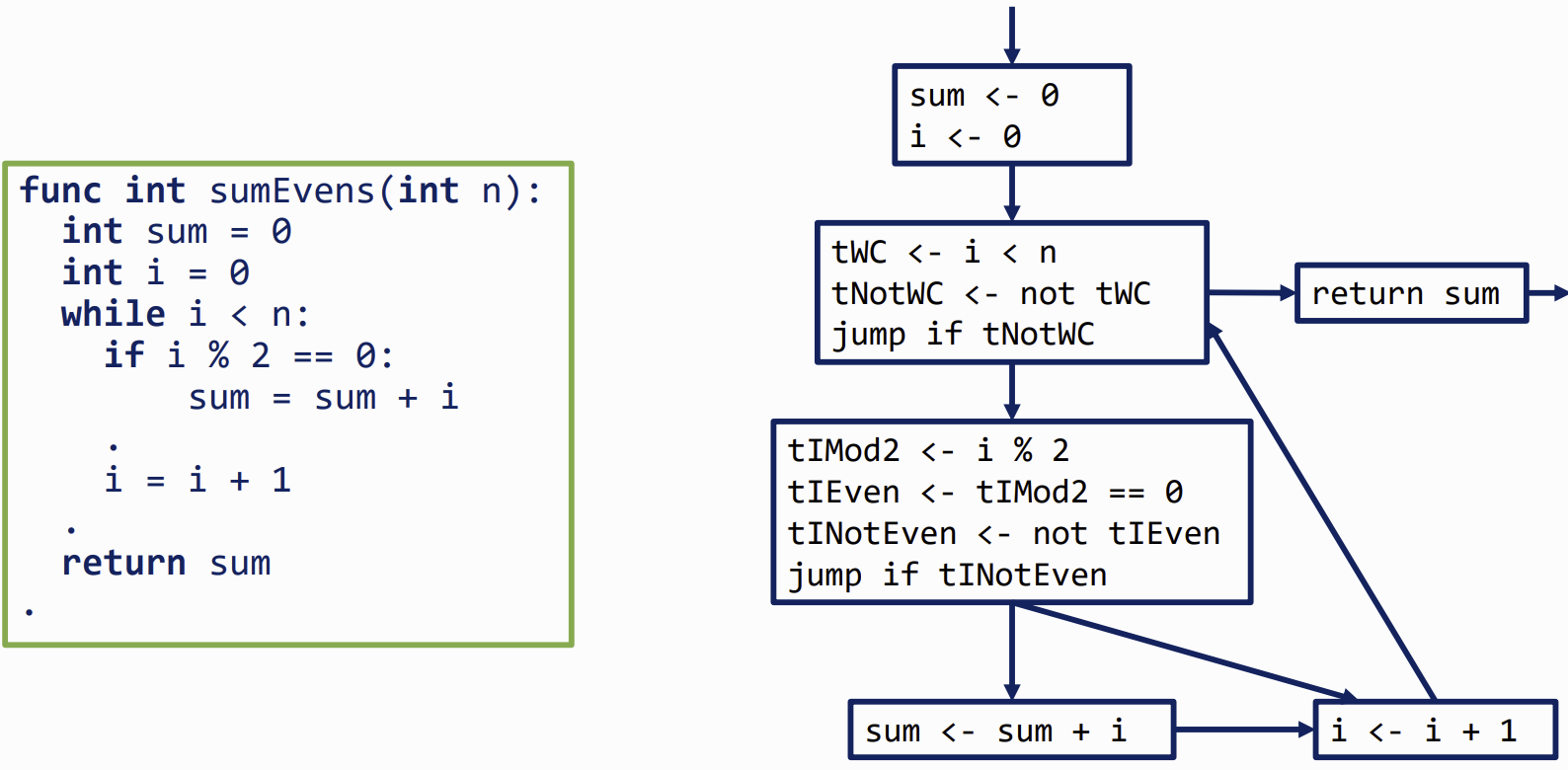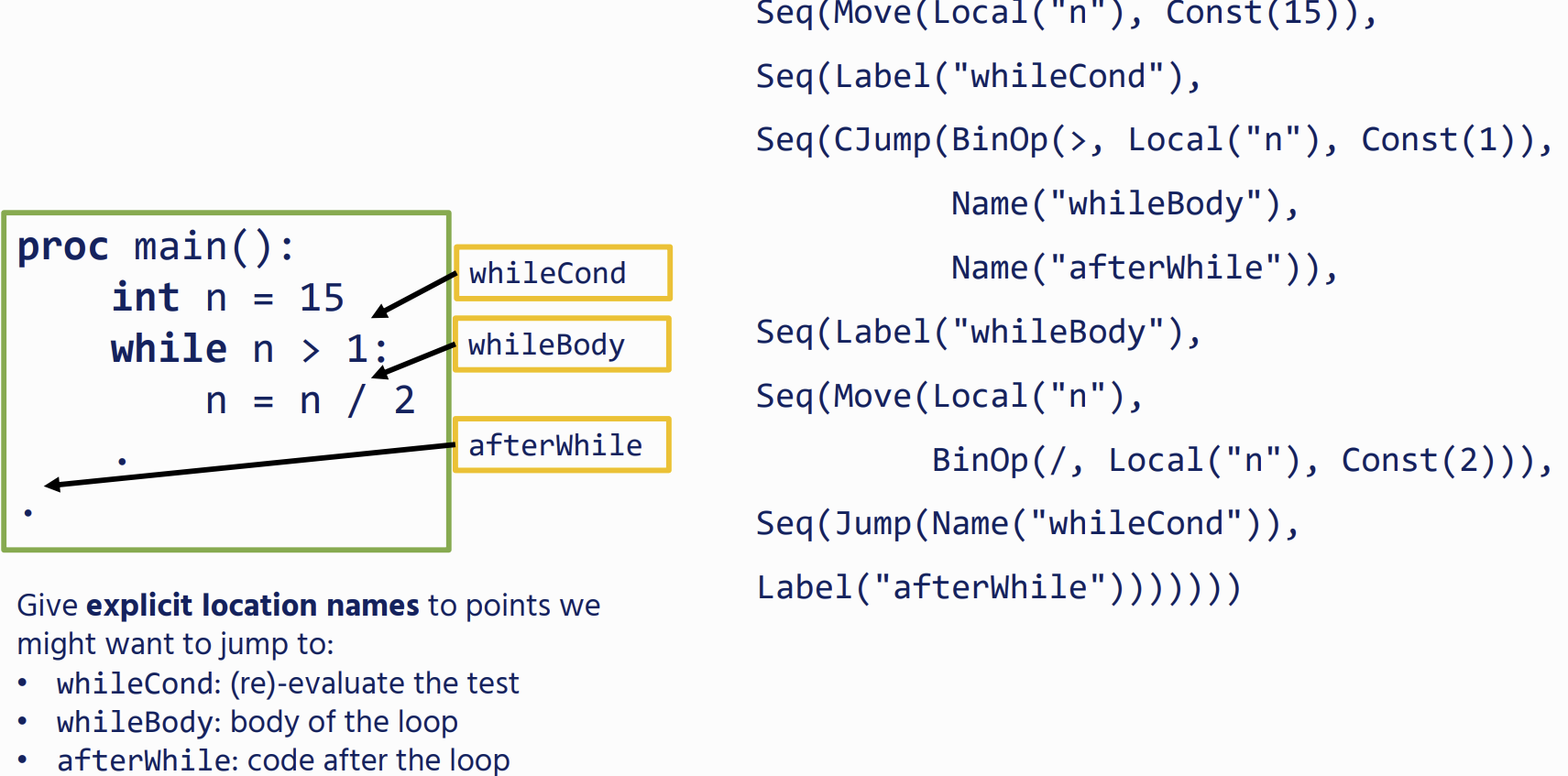- emit code for the loop body, along with an unconditional jump back to the test