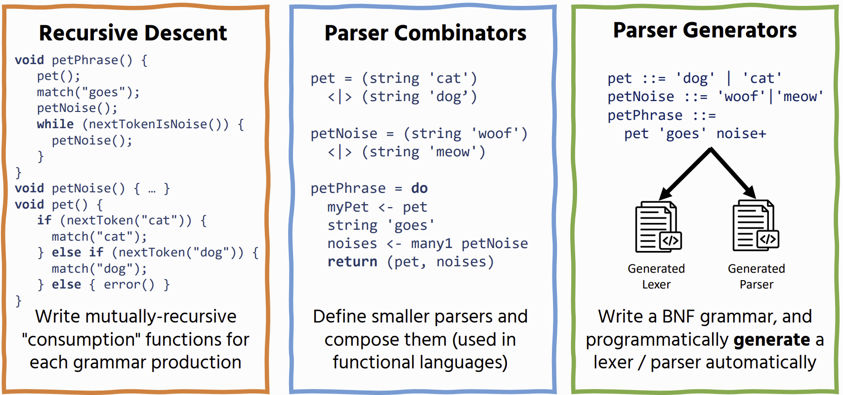 Parsers take unstructured text and turn it into a structured representation (parse tree) based on the rules of a grammar