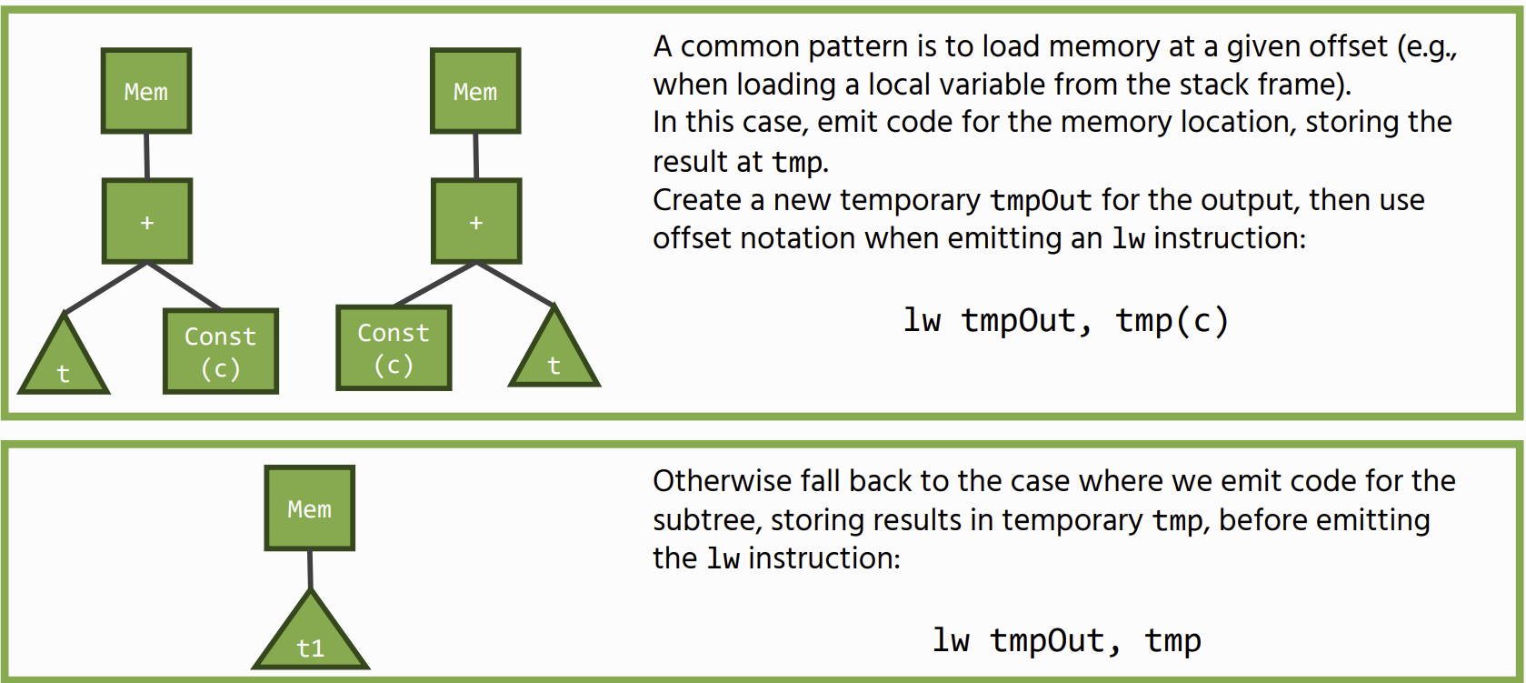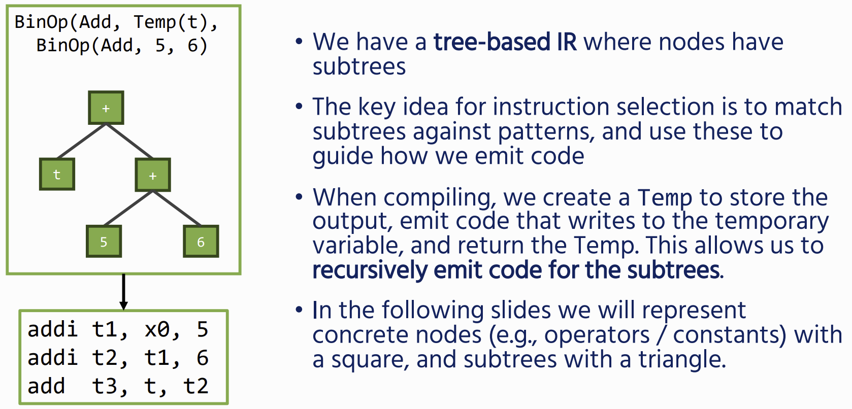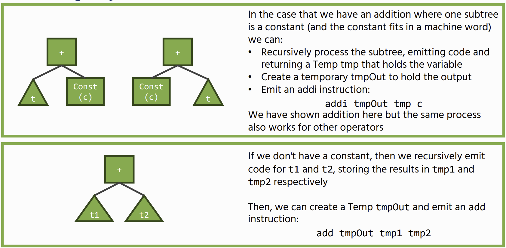 Often there are multiple different ways of compiling the same IR – we ideally want to optimise for, for example the smallest number, or most efficient instructions, this is a job for Instruction selection