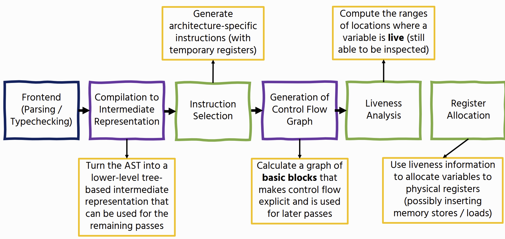 parsing : transform source code (strings) into a structured representation → Type checking : Check that source code does not have type errors (for typed languages) → Desugaring : translate complicated constructs into smaller ones (dont have to duplicate logic) → IR Conversion : translate into intermediate representation → Optimisation → Compilation/Interpretation: Either interpret the code, emit lower-level code