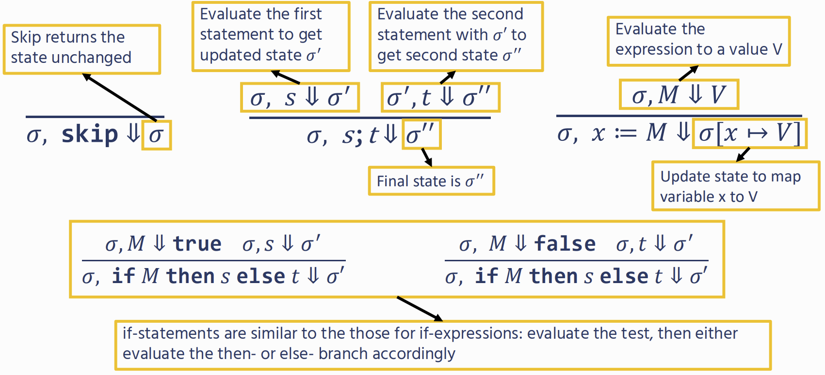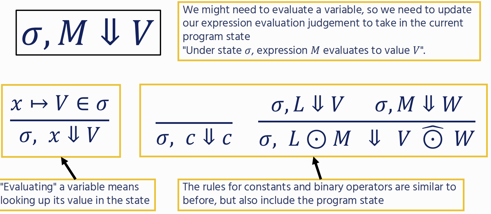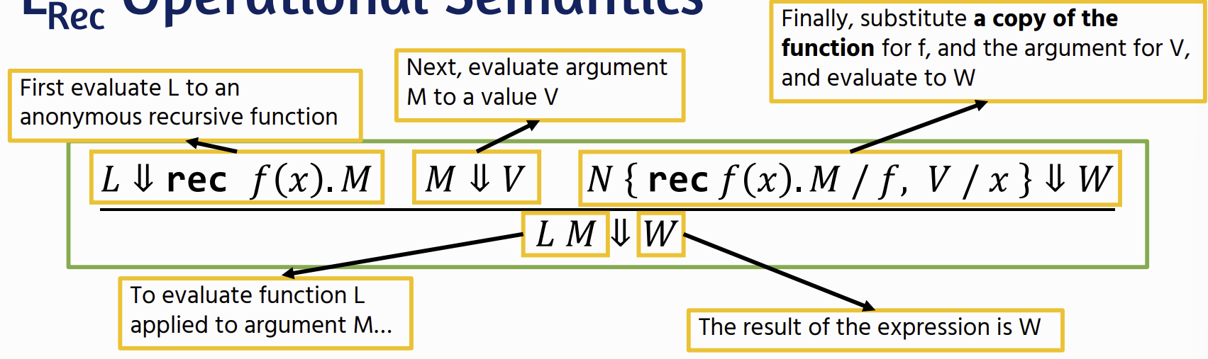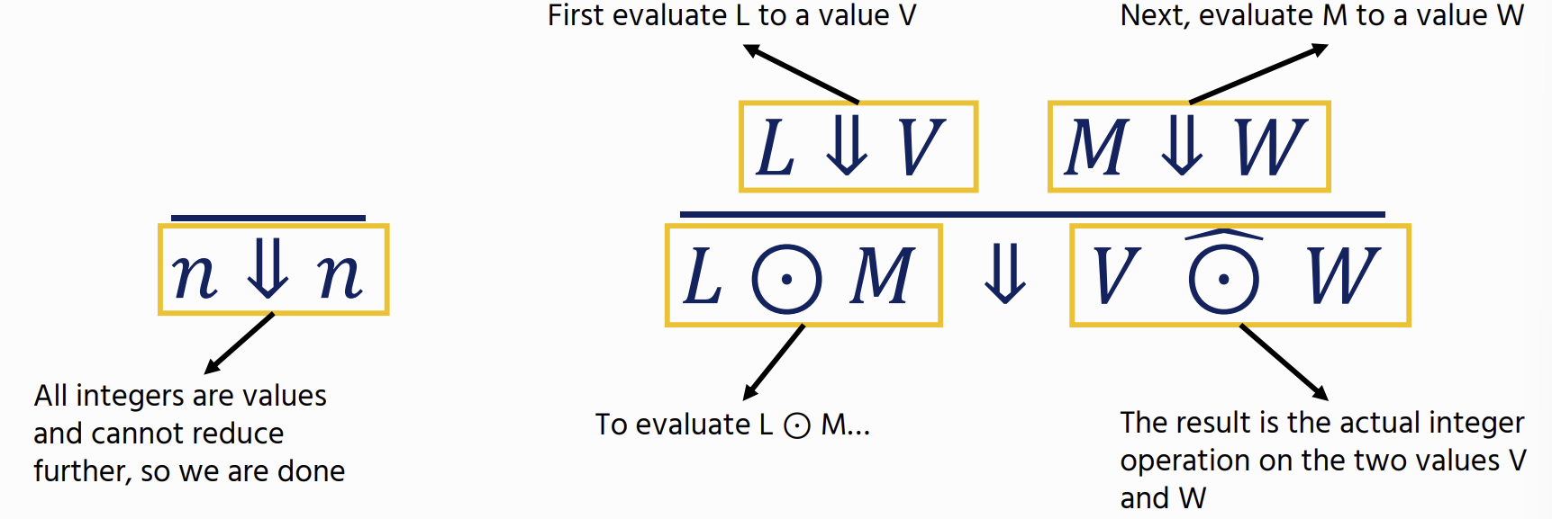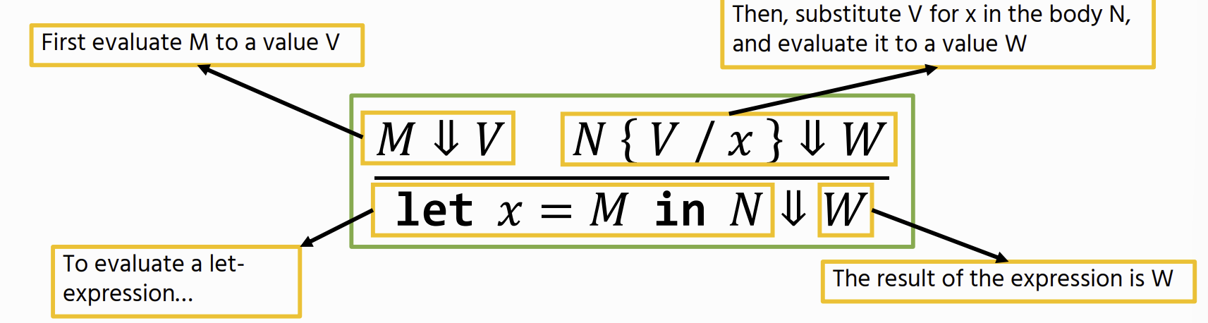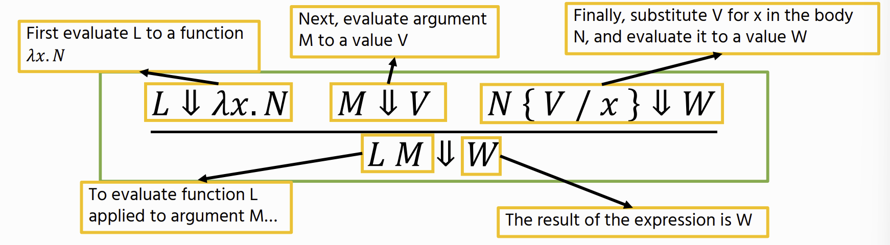M ⇓ V : shows how an expression M evaluates to a value V. (aka a judgement)