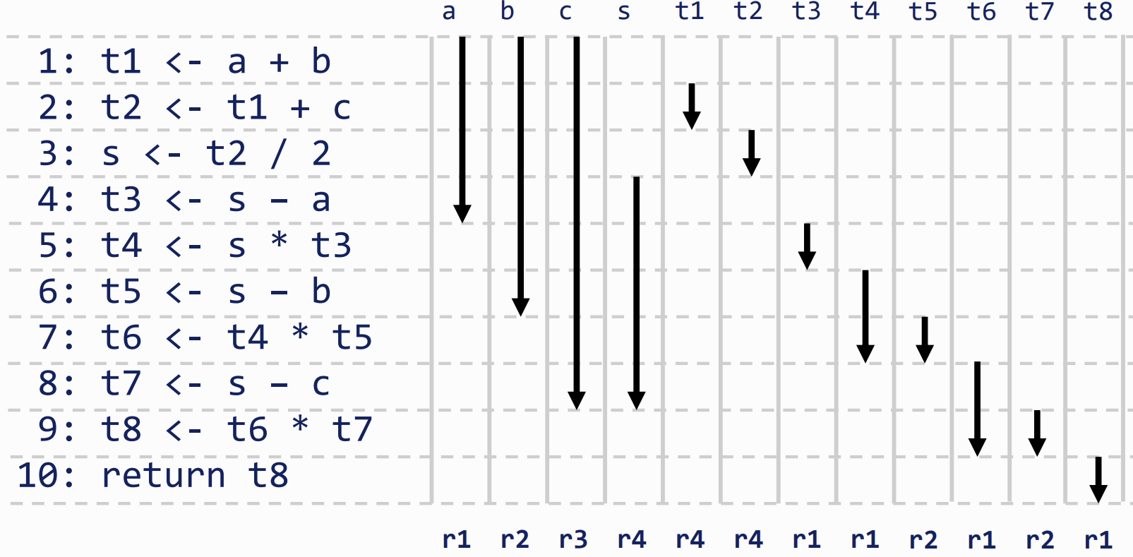 the registers required is calculated/allocated based on non-overlapping liveness ranges