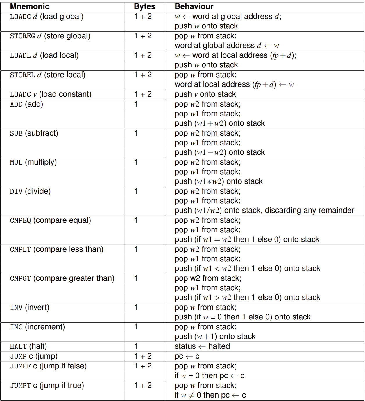 - 1-byte instructions do not have any arguments associated with the instruction