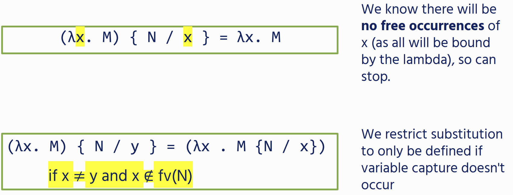 M {V / x} : Replace all free occurrences of x in term M with value V