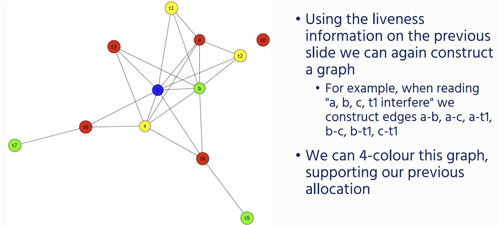 - We add an edge between two variables if they are live at the same time (i.e., simultaneously occur in a node’s live-out set).