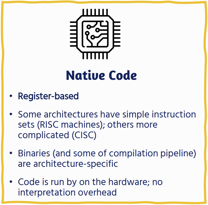 - Performance: There is no interpretation overhead: code is run directly by the hardware • We can also make use of architecture-specific optimisations